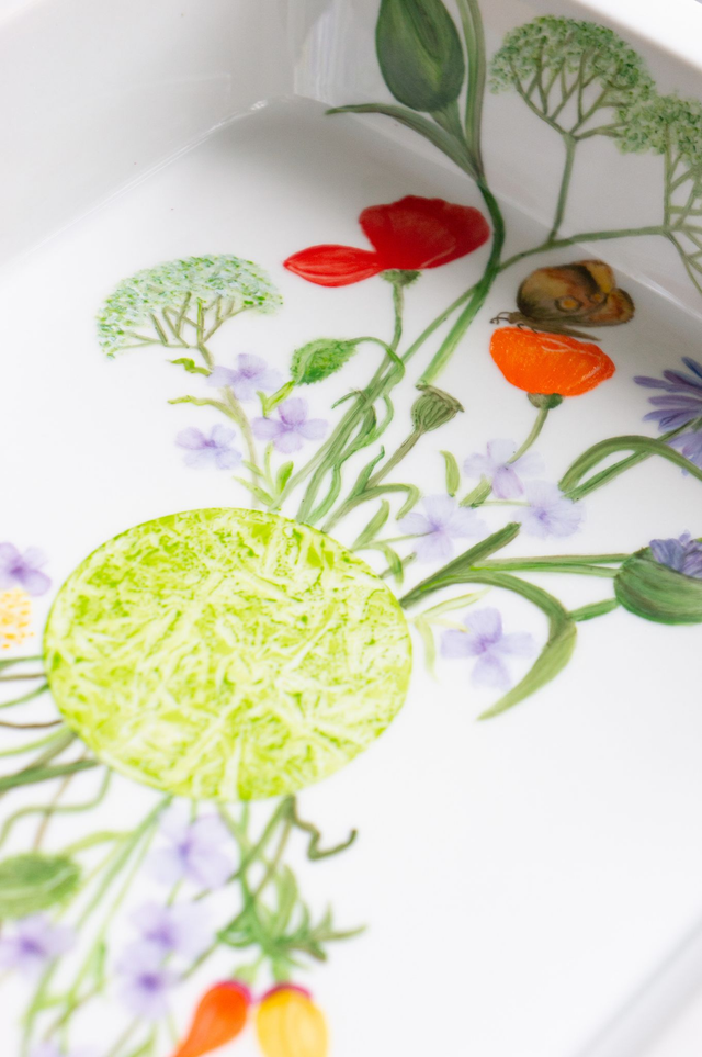Un grand plat rectangulaire en porcelaine fine, adapté à la cuisson au four, entièrement peint à la main . Son décor champêtre composé d'un bouquet de fleurs des champs se déploie avec délicatesse ponctués d’insectes gracieux . Chaque détail est minutieusement travaillé au pinceau, avec des nuances fines et des couleurs lumineuses .
