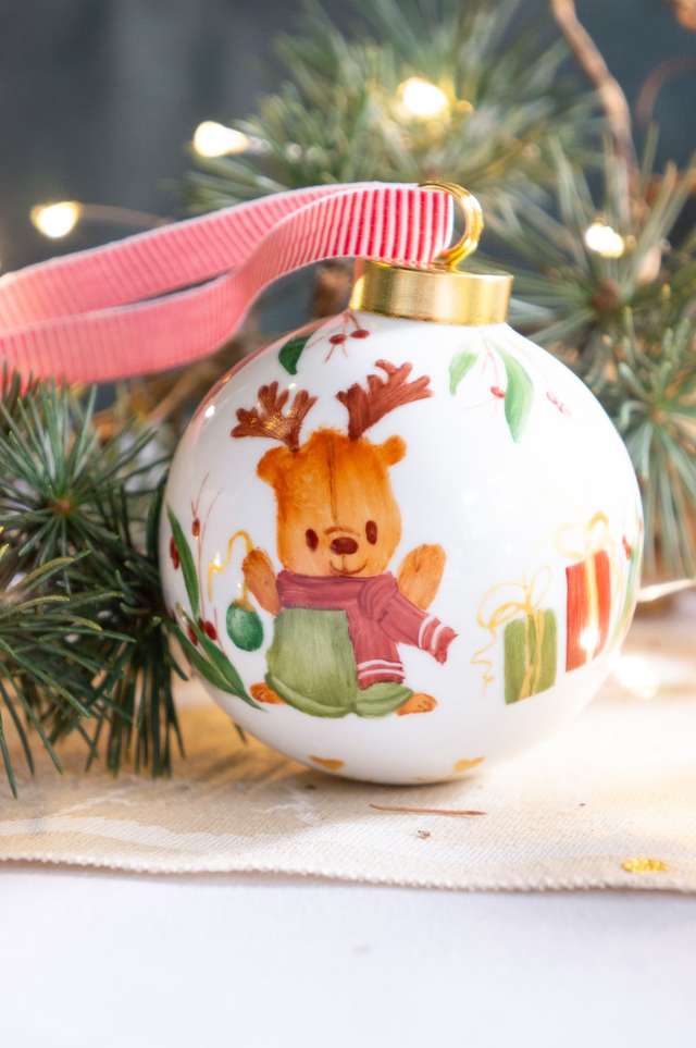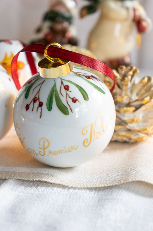 Chaque boule est personnalisable avec le prénom et éventuellement la date de l’enfant, peints à la main pour en faire une pièce vraiment unique .
