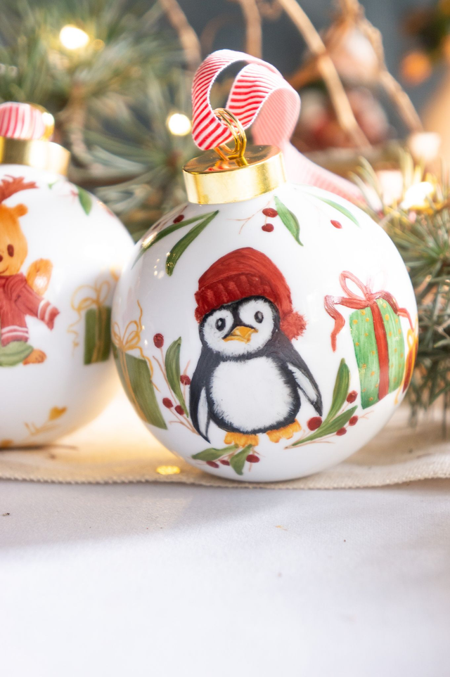 Boule de Noël personnalisée, Mon Premier Noël avec prénom, en porcelaine, motif renne ou pingouin