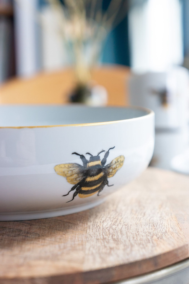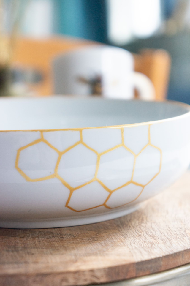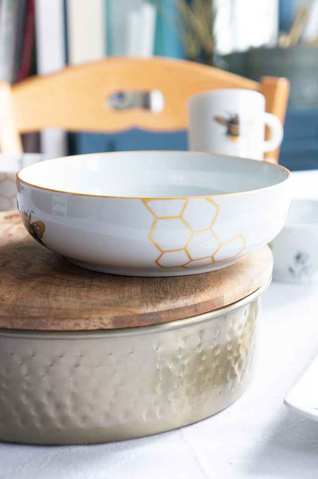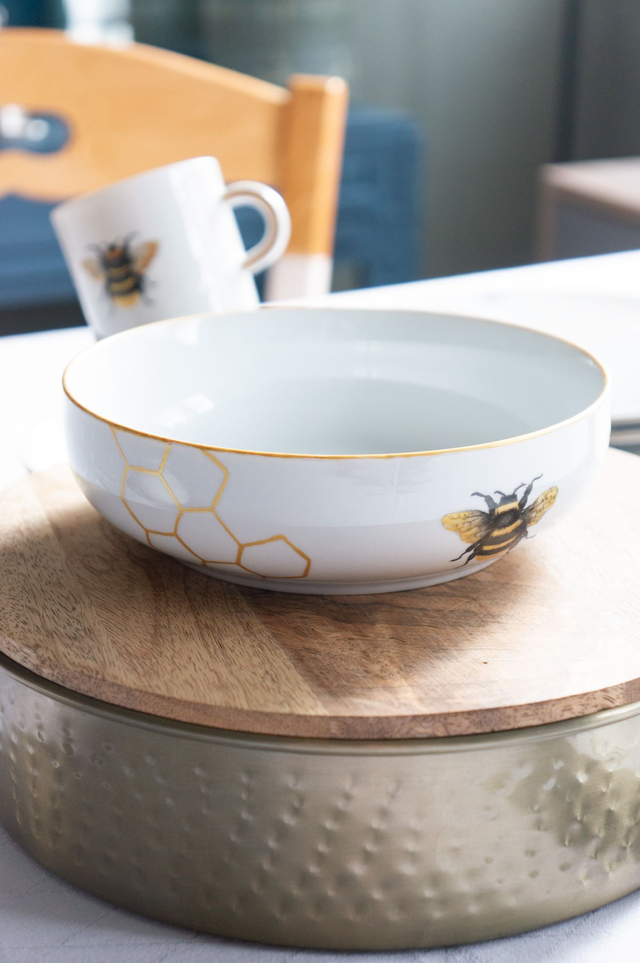 Grande coupelle d’exception en porcelaine fine, Abeilles & alvéoles dorées, peinte à la main