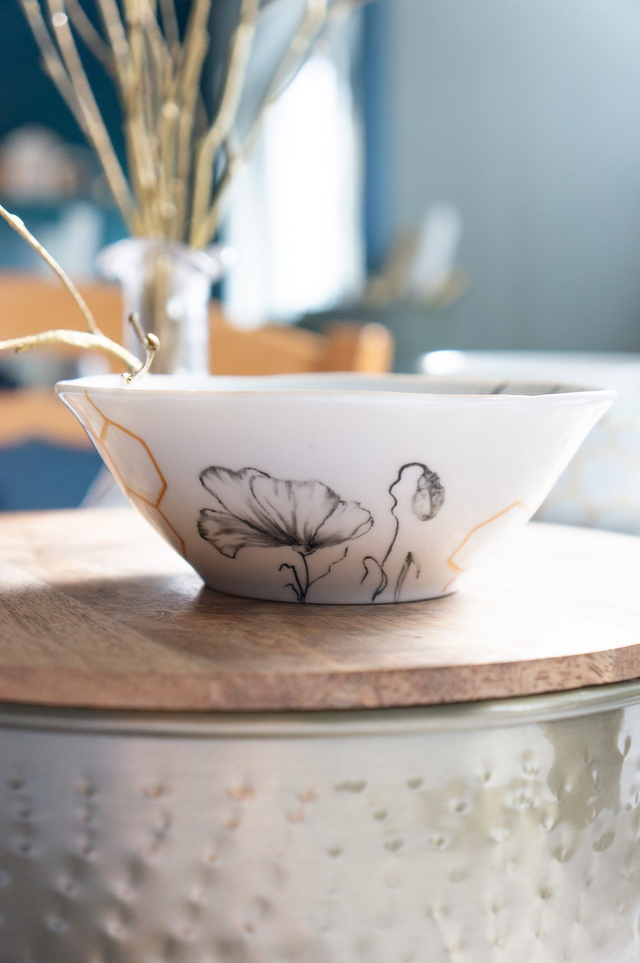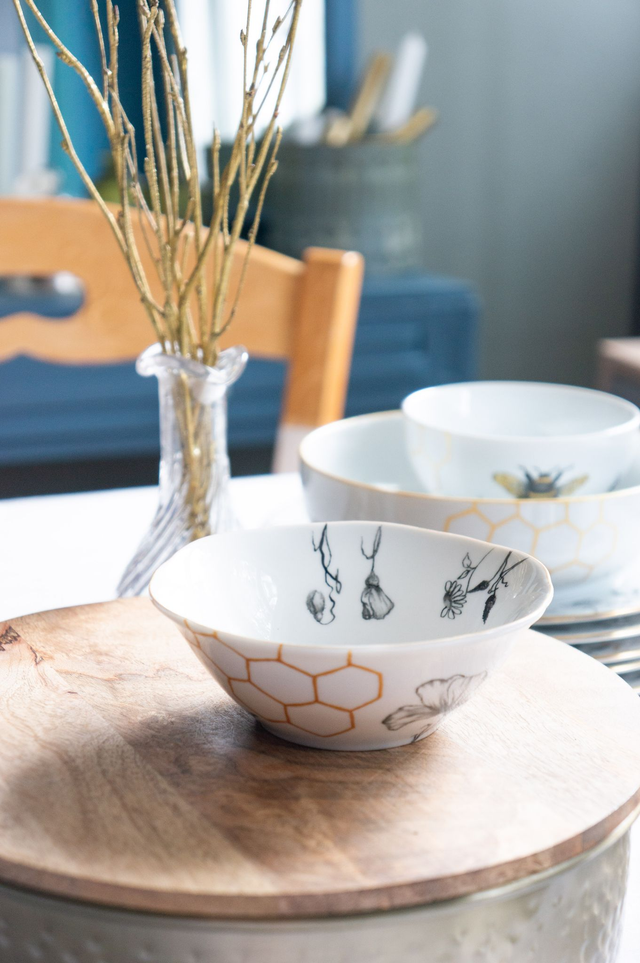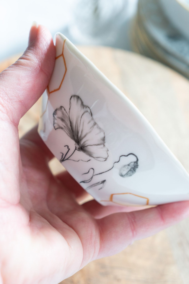 Petite coupelle en porcelaine fine, Collection L’Or des Abeilles, Abeille & alvéoles dorées, peinte à la main